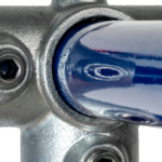 A three way side outlet tee allowing three tubes to join at 90° to each other with the vertical passing through the fitting. Typical use would be on structures such as market stalls or play frames. This clamp does not allow tubes to be joined within the fitting.